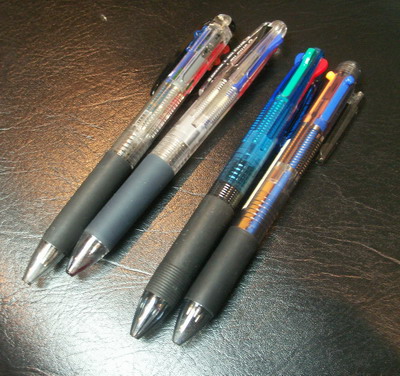 まずは写真をご覧頂こう。 4色ボールペンです。 よく使うんですが、よく無くします。 よく無くすんで、無くさないでおこう、と思うんですね。 先週末は、「無くさないぞ!」と心に決めてました。 で、2本だけ持って普通に仕事をしてました。 先週末は 姫路でライブPA→移動 大阪で録音→移動 相模湖らへんで録音。→移動 という感じで動いていたのですが、相模原から帰ってかばんの中を見たら4本に増えてました。 はい、増えてました。 「無くさないでおこう」という気持ちがボールペンを倍にしてくれました。 不思議です。 (「あれ?俺、無くさないでおこうと思ってたのに、こんなところに落としてた!」 と、思ったのが2回ほどあったんですが、それってボールペンが増えたことと関係あるんかなぁ・・・。) そんなこんなでボールペンが何故か増えるという不思議体験をすることで、お金がお金のあるところに集まる感じがなんとなく理解できました。 勉強になった。 ちなみに去年の年末、スタジオの待合室にあるライターを集めて数を数えたら、38個ありました。 それもなんか似てる。 ![]()
